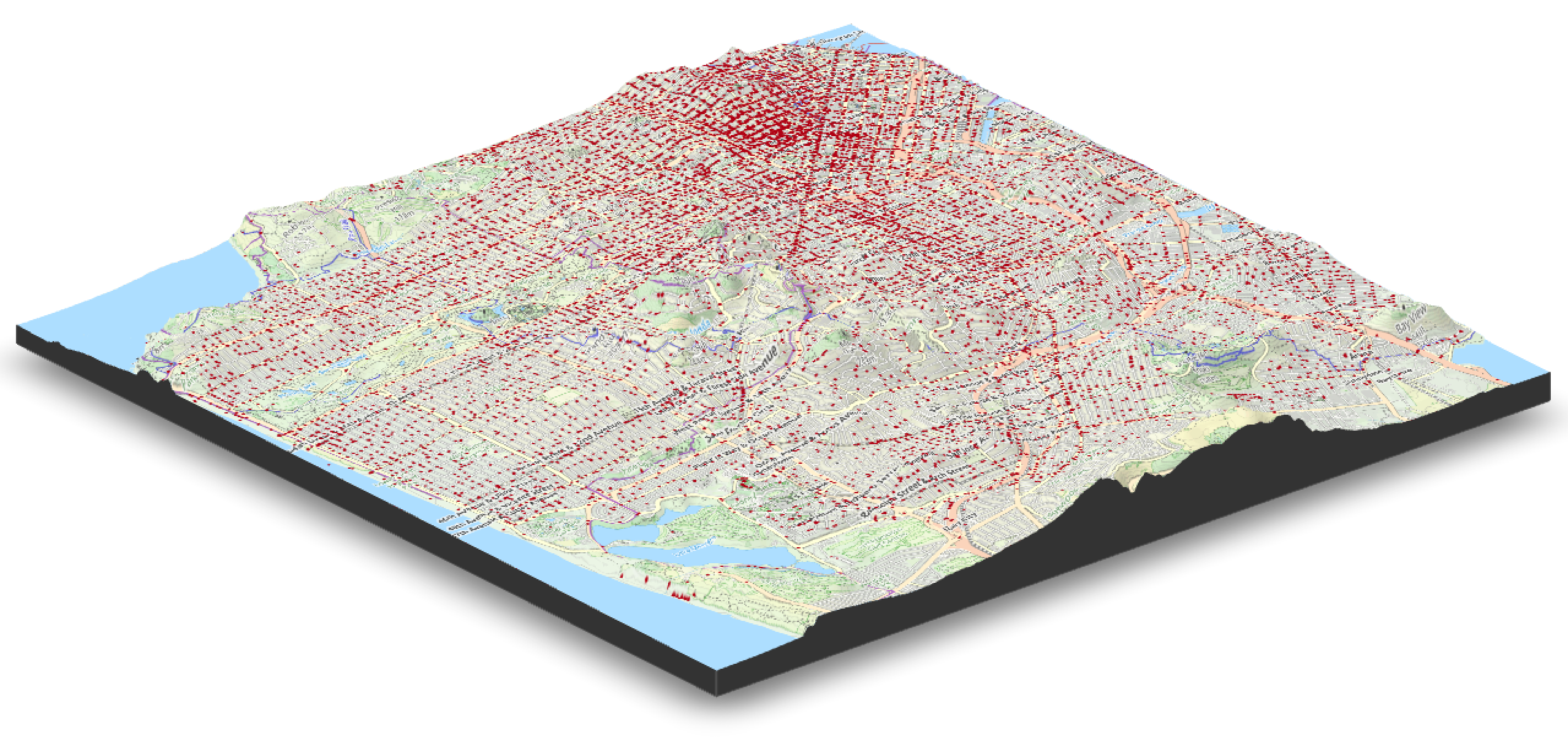 Несомненно, на модели можно накладывать и другие слои с исходными данными или результатами моделирования, что делает технологию весьма привлекательной (см., например, статью Adding Open Street Map Data to Rayshader Maps). Приведем еще один пример, сделаем слой на 3D-модели, показывающий происшествия, на которые отреагировала пожарная служба Сан-Франциско. Отметим, соответствующий набор данных также содержит географические координаты.