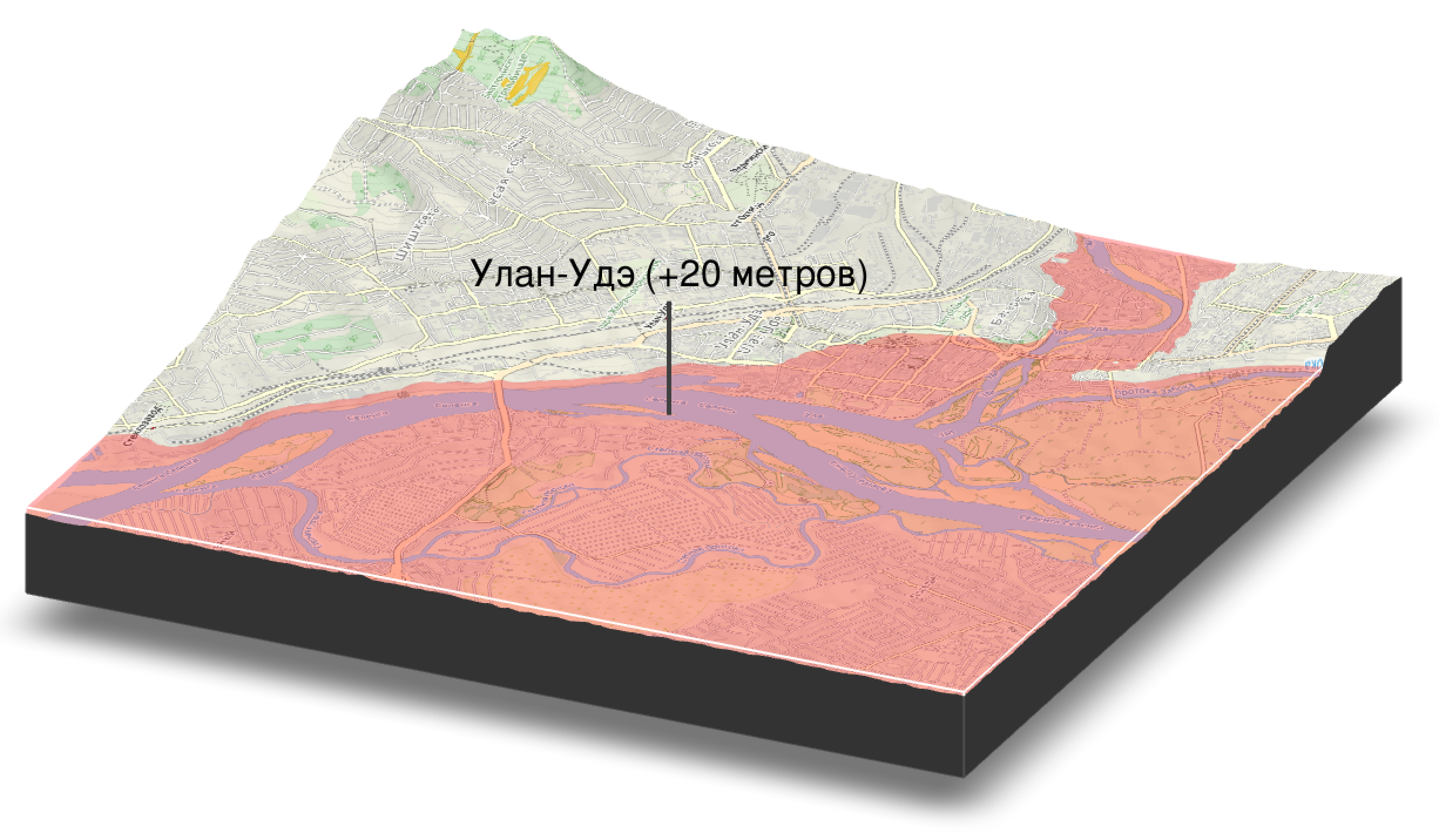 Одна из интересных возможностей, для которой может быть полезна библиотека rayvista – это оценка природных рисков наводнений локальных территорий путем параллельного поднятия плоскости воды. В качестве примера рассмотрим г. Улан-Удэ. Выберем точку внутри города с определенными географическими координатами и найдем оценочную высоту над уровнем моря с помощью сервиса Elevation Finder, в нашем случае это 490 м (в rayshader также существует команда detect_water()). Получим модель местности и поднимем уровень на 20 м до 510 м, чтобы сделать оценку риска затопления.